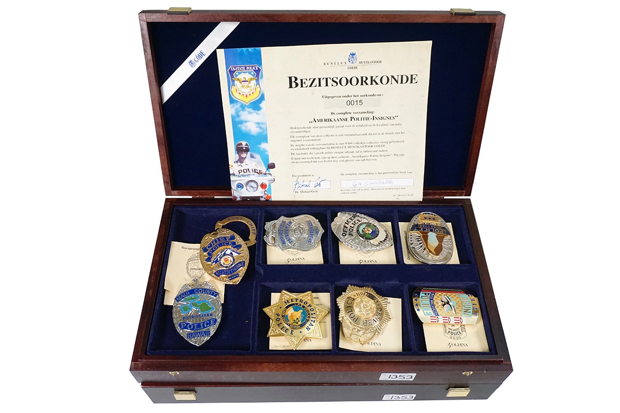 Twee houten dozen van het Benelux Muntkantoor Goede “Amerikaanse Politie-Insignes” (badges). Maar liefst 37 stuks. Net ‘Blik op de Weg’ maar dan anders. De dozen zijn goed bruikbaar.