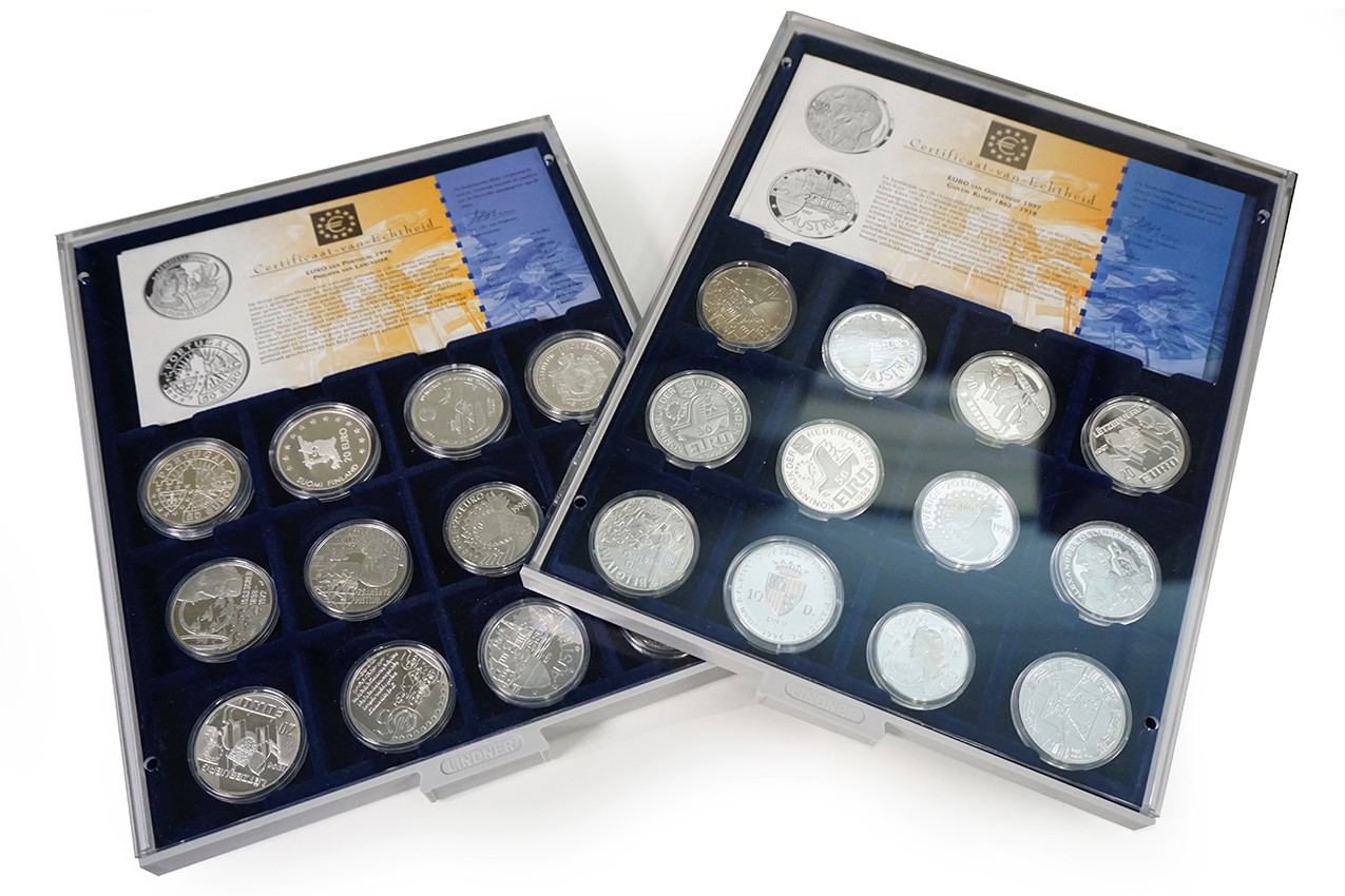 Twee Lindnercassettes “De Internationale Euro Collectie” met 23 zilveren + 1 kopernikkelen penning. Netto zilver: 533 gram.