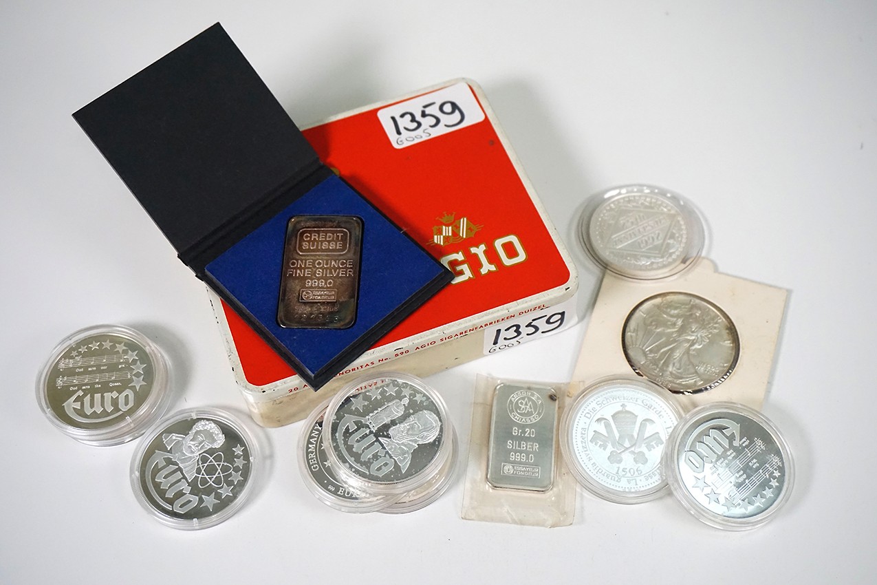 Blikje 999/1000 zilver. Baren, penningen & troy ounces. Netto zilver: 281,6 gram.