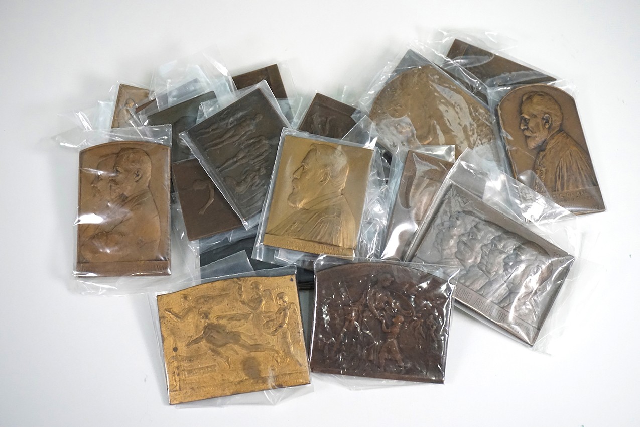 Doosje met 23 stuks plaquettepenningen, vnl. België. Veel Art-Déco stijl!