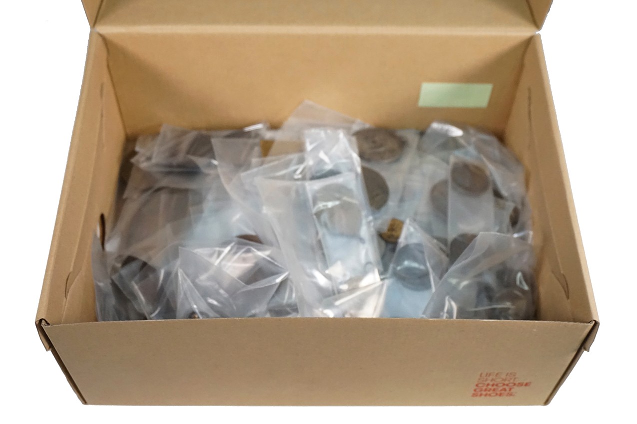 Schoenendoos met 101 penningen, vnl. België, maar ook andere landen. Klein- en grootformaat.
