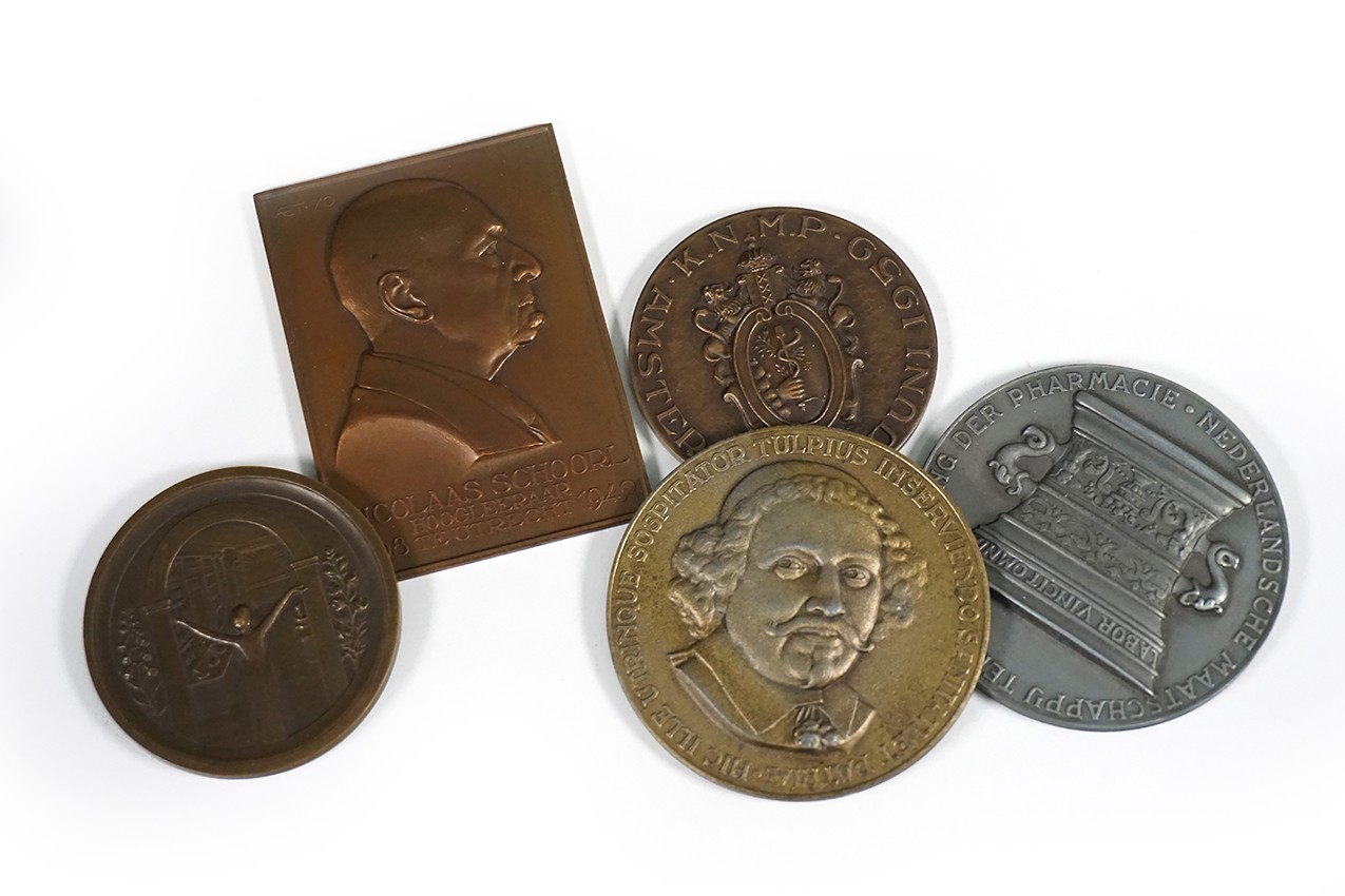 Lot (5), 4 penningen en 1 plaquette met betrekking tot de pharmacie.
