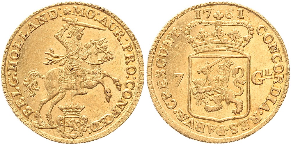 ½ Rijder of 7 gulden 1761. Delm. 783; CNM 2.28.48; HPM 20 [4,97 gram]. Prachtig.