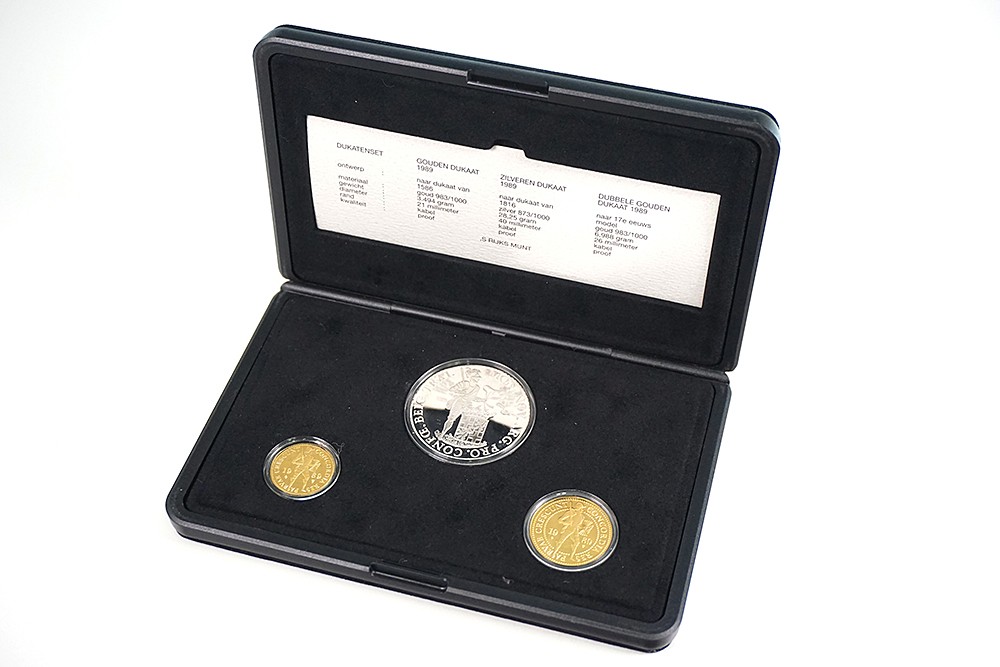 Dukatenset 1989, enkele en dubbele gouden dukaat alsmede zilveren dukaat. Proof in cassette.