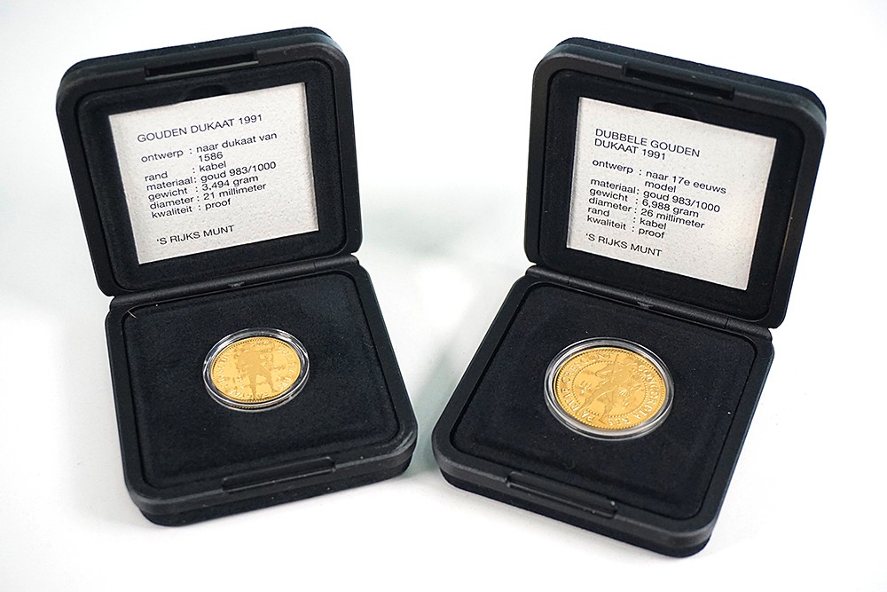 Lot (2) Enkele en dubbele gouden dukaat 1991. Proof in cassette.