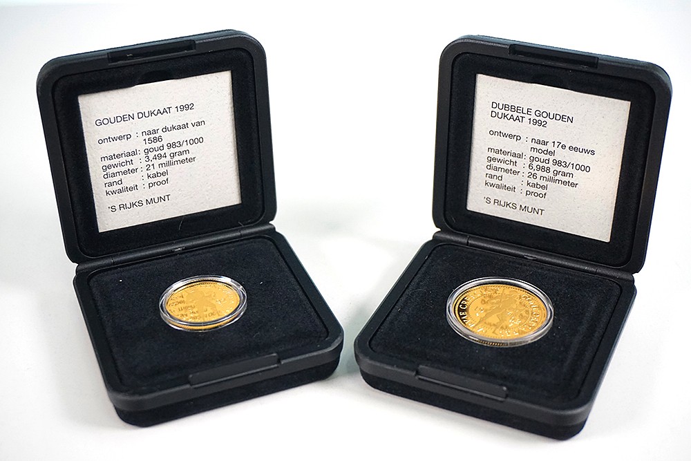 Lot (2) Enkele en dubbele gouden dukaat 1992. Proof in cassette.