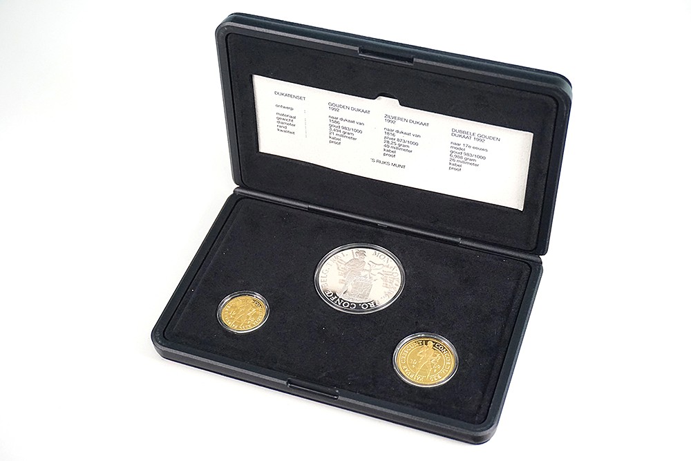 Dukatenset 1992, enkele en dubbele gouden dukaat alsmede zilveren dukaat. Proof in cassette.