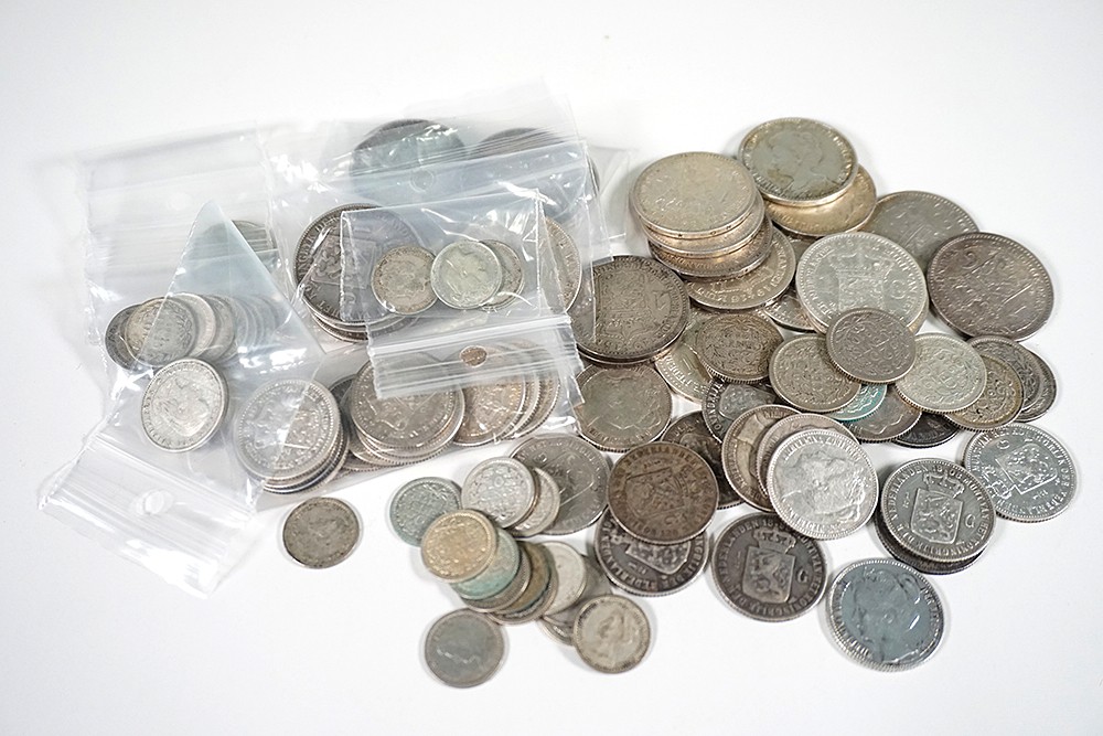 Sigarenblikje ‘Elisabeth Bas’ zilveren Wilhelminamunten jeugdportret, inhuldigingstype en hermelijnen mantel (100). Dubbeltjes, kwartjes, ½ guldens en guldens. Diverse kwaliteiten.