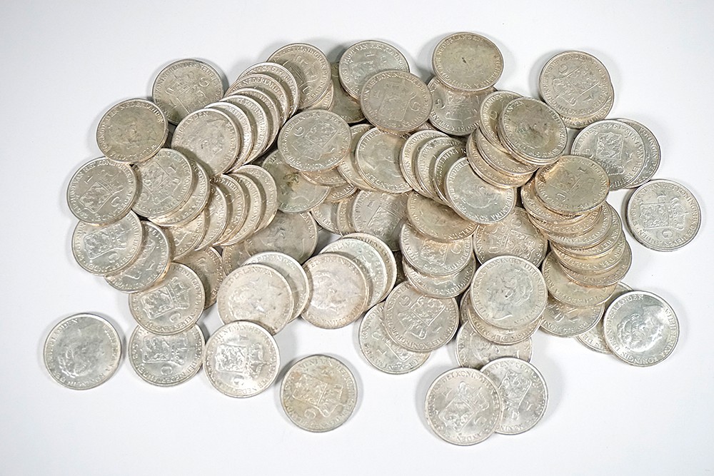 Sigarenblikje (95) guldens Wilhelmina 1943DP in mooie kwaliteit. Netto zilver: 681 gram.