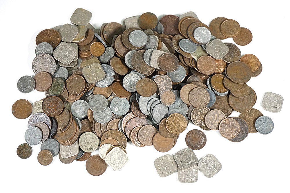 Doosje met onuitgezocht brons-, nikkel- en zinkgeld. O.a. 50 x 1 cent WIII - Wilhelmina, 75 x 2 ½ cent 1877-1941, 5 cent 1909 en ca. 65 stuks zink 1cent – 25 cent. Ca. 40 stuks 5 cent vierkant.