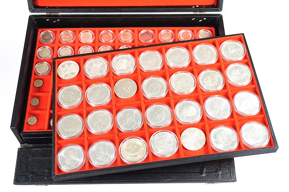 Zwarte koffer met 200 zilveren munten Willem II t/m Juliana in 4 laatjes. Veel mooie kwaliteiten, ook moeilijke jaartallen (o.a. 25 Cents 1901 brede hals), met iets overzee.
