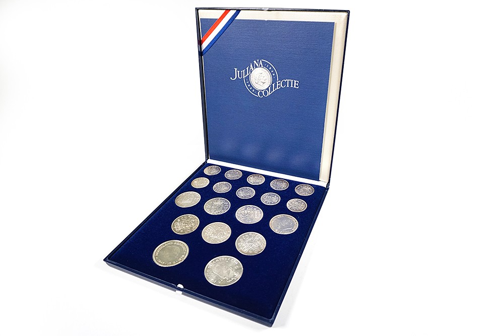 Juliana-cassette zilver, bestaande uit 10 zilveren guldens 1954-1967, 7 rijksdaalders 1959-1966 en 2 tientjes van 1970 en 1973.