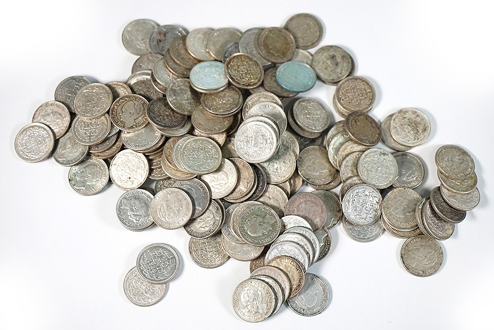 Plastic bakje zilveren Wilhelminakwartjes 1926-1944. Netto zilver: 377 gram.
