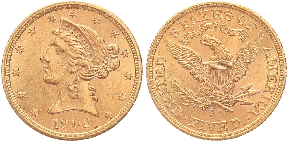 5 Dollars 1902 San Francisco. Fr. 145; KM 101. VF / EF.
