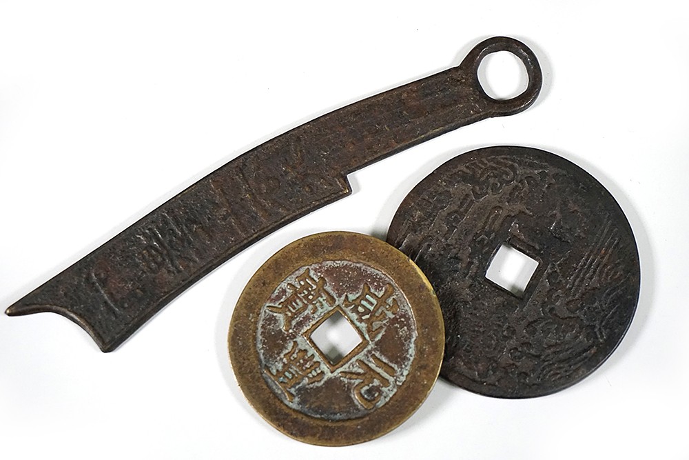 Sigarenblikje ‘Jules Verne’ met twee grote Chinese amuletten en 1 x messengeld. Allen vals, maar decoratief in de etalage.
