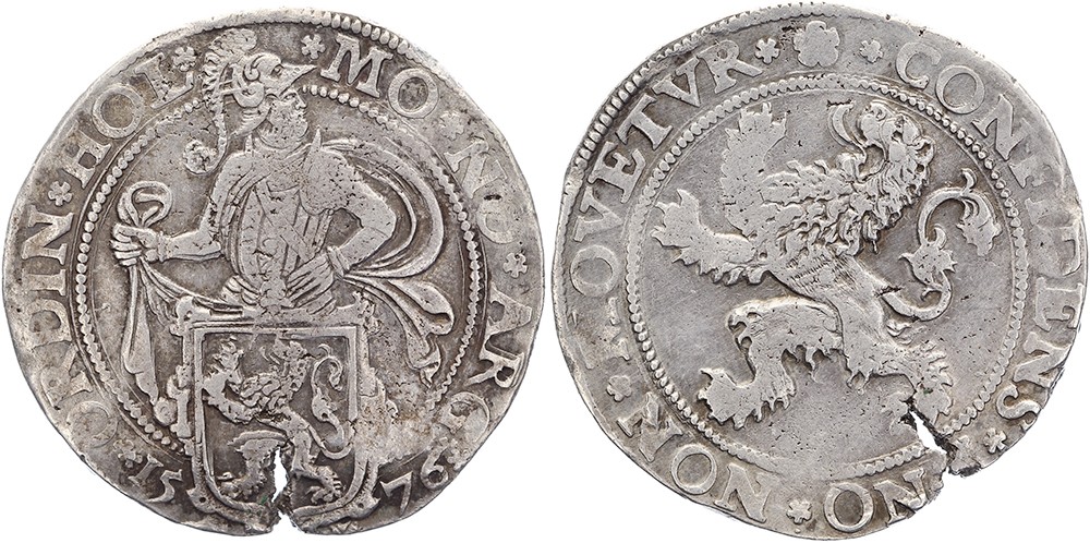 Leeuwendaalder 1576 op Hollandse voet; interpunctie: rozetje. Delm. 831; CNM 2.28.66; HPM 22. Scheur in muntplaatje, overigens vrijwel zeer fraai.