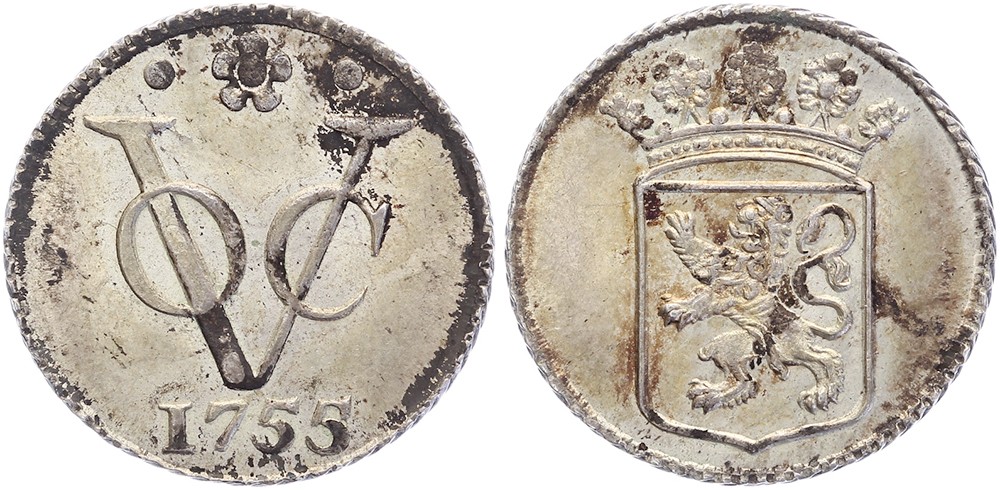 Duit 1755 afslag in zilver van 3,1gram. PW 2007.5; CNM 2.28.126; HPM 84.3. Donkere zwarte aanslag. Zeer fraai.