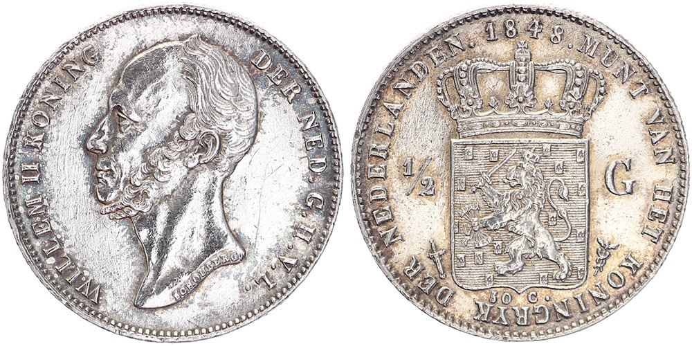 1/2 Gulden 1848 mmt. zwaard Sch. 531. Schoongemaakt Zfr / prachtig