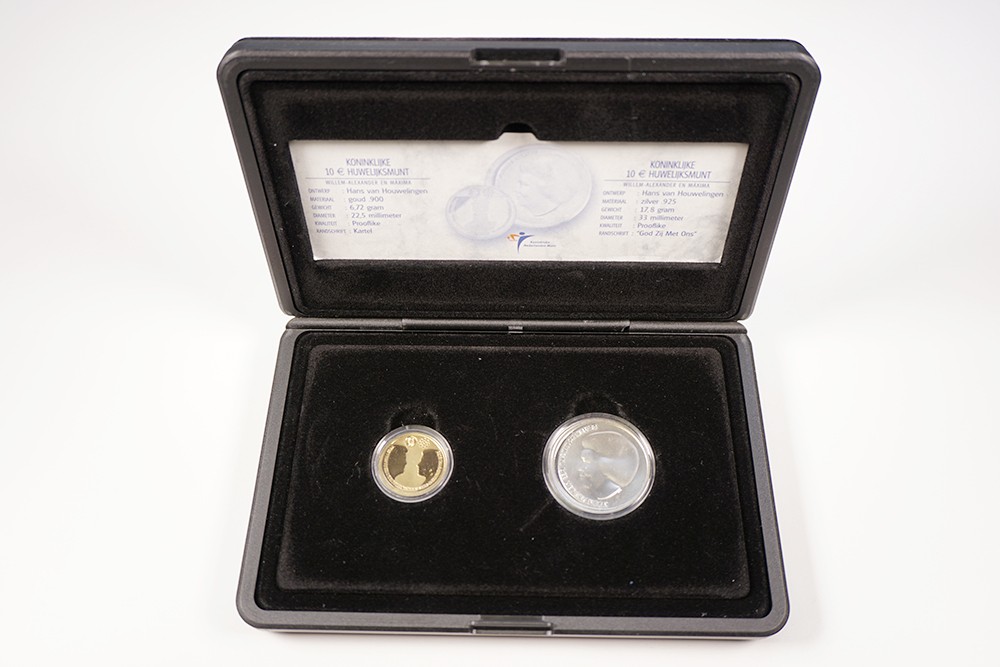 Gouden + zilveren 10 euro 2002 huwelijk Willem-Alexander & Máxima. Prooflike in KNM-cassette.