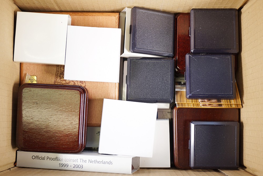 Doos met allerlei euro-uitgiften 2002-2014, officieel en officieus. O.a proofsets, TPG-postsets, € 2 dubbelportret 2014 in FDC en proof, € 10 Van Gogh in goud + diverse postzegels.