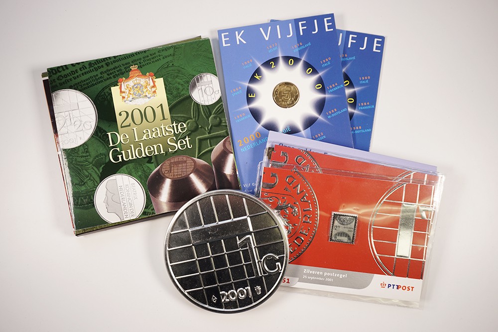 Grote doos met vnl. guldenuitgiften: minimuntsets (7x, w.o. 2002); laatste gulden in FDC en proof (8x); zilveren gulden 2001 (5x); zilveren postzegels (6x); zilveren schaatsdaalders (6x); EK-vijfjes in FDC en proof (15x); Benelux set 1994 (2), enz. enz. Alles in originele verpakking.