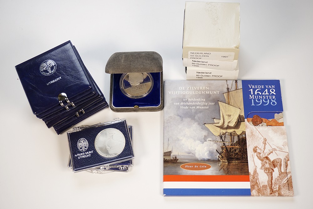 Grote doos met 116 x 50 gulden herdenkingsmunten 1982-1998 in FDC en proof. Allen in originele verpakking. Netto zilver: 2.682 gram.