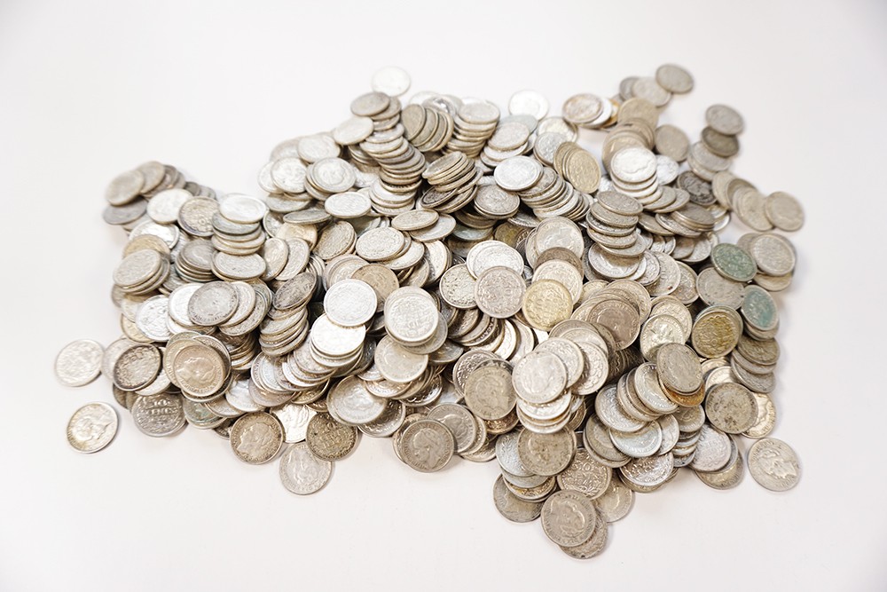 Doosje met veel zilveren Wilhelminadubbeltjes (type 1926-1944). Netto zilver: 663 gram.