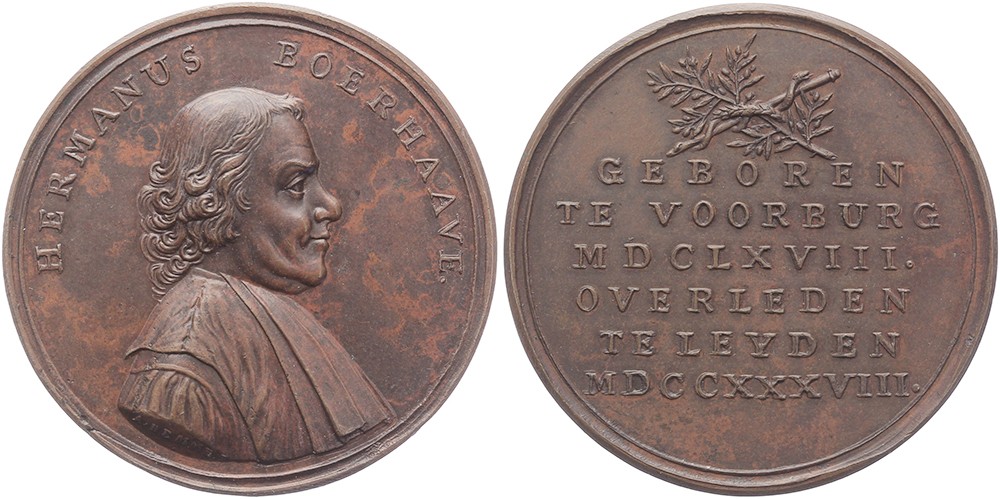 (± 1815) Hermanus Boerhaave 1668-1738. Borstbeeld naar rechts. / Zesregelig opschrift. Æ 49,7. Brettauer 136. A. Bemme. Lichte verkleuringen voorzijde. Prachtig.