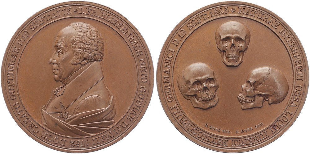 1825 Dr. Johann Friedrich Blumenbach. Borstbeeld naar links. / Drie schedels, van Kaukasische, Afrikaans en Mongools ras. Æ 50,5. Brettauer 125. H. Gube. Prachtig / FDC.