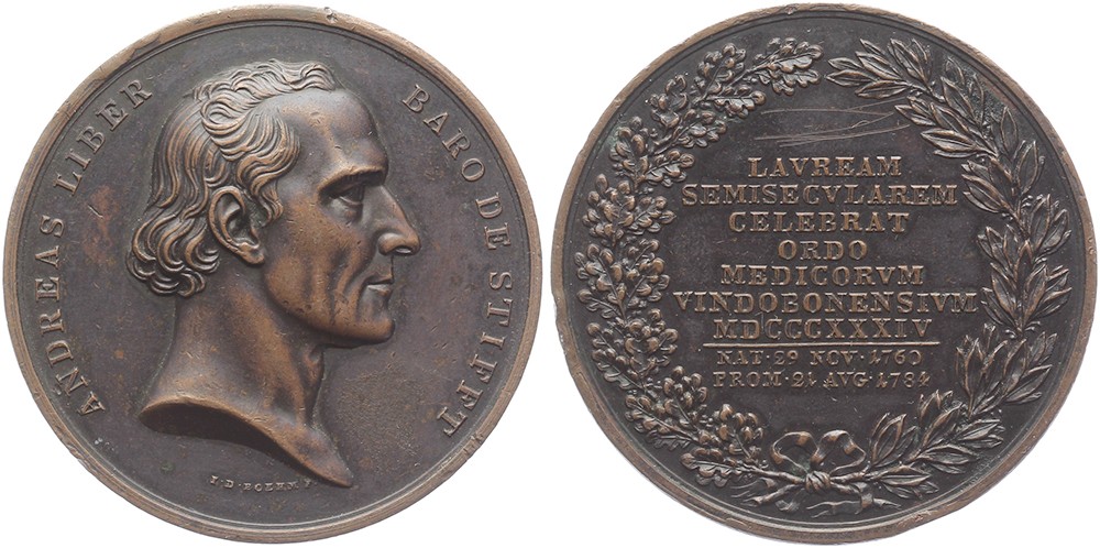 (1834) Wien. Leibartz von Franz I (II), Josef Freiherr von Stifft. Borstbeeld naar rechts. / Negenregelig opschrift binnen gestrikte lauwer- en eikentak. Æ 52. Brettauer 1175. J.D. Boehm. Krasjes keerzijde en randoneffenheden (Krätzer Rs. und Randfehler). Prachtig.