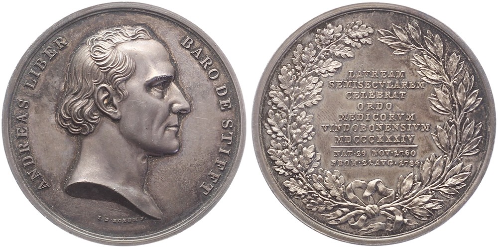 1834 Auf das 50-jährigen Doktorjubiläum von Andreas Lieber Baro de Stifft. Kopfbildnis nach rechts. / Neun Zeilen Schrift im Eichen- und Lorbeerkranz. AR 51,6 [61,40 g]. Slg. Mont. 2525. J.D. Boehm. Schöne Patina. Vorzüglich / Stempelglanz.