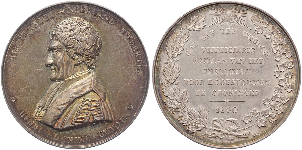 1840 Groningen, 50 jaar instituut voor doofstommen. Borstbeeld Henry Daniël Guyot naar links. / Tekst. AR 41,8 [19,28 gr.]. Dirks 563; Brettauer 4808; Freeman 220. D. van der Kellen. Patina. Prachtig / FDC.
