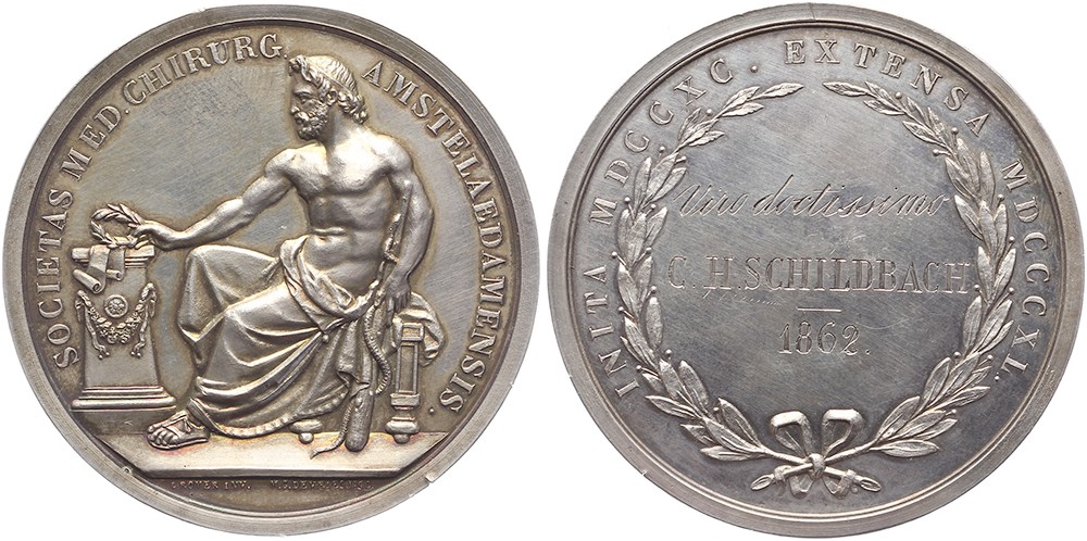 1840 Amsterdam. Erepenning Genees- en Heelkundig Genootschap. Zittende Aesculapis; in zijn linkerhand staf met kronkelende slang; in zijn rechterhand een lauwerkrans boven versierd altaar houdend, SOCIETAS MED. CHIRURG. AMSTELAEDAMENSIS / Inscriptieruimte binnen gestrikte lauwertakken. Op naam van: VIRO DOCTISSIMO C.H. SCHILDBACH 1862. AR 56,4 [60,64 gr.]. Dirks 571. M.C. de Vries. Zeldzaam. Twee inkepingen op rand, anders prachtig / FDC. N.B. Ex veiling 30 Laurens Schulman, november 2004, kavel 2131. Volgens catalogus ’s Rijks Munt in 1880 gesneden, iets wat de inscriptie tegenspreekt.