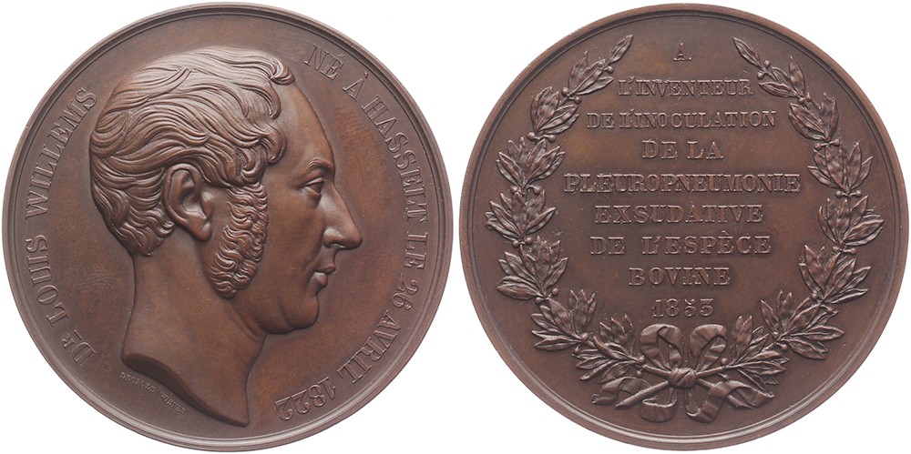 1853 Hasselt. Dr. Louis Willems, l’inventeur de l’inoculation de la pleuropneumonie. Hoofd naar rechts. / Negenregelig opschrift binnen gestrikte lauwertakken. Æ 62,4. Brettauer 1324; Freeman 560. L. Wiener. Vrijwel FDC.