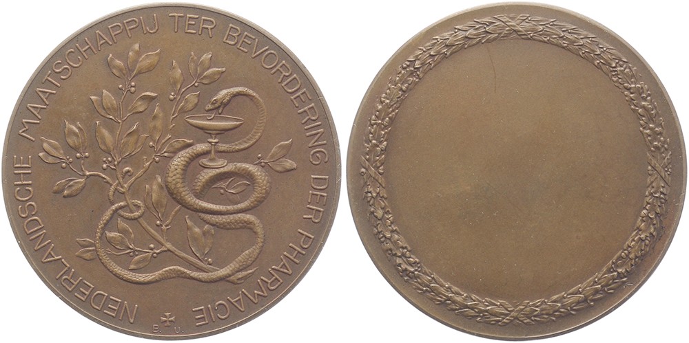 (1898) Erepenning Nederlandsche Mij. ter Bevordering der Pharmacie. Gifbeker met slang en lauwertak. / Inscriptieruimte binnen krans. Æ 47. Zw. 1366; KB I-347. Prachtig.