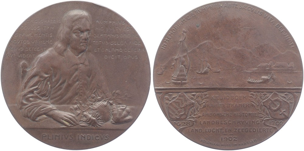 1902 Overlijden G.E. Rumphius 200 jaar geleden. Aan tafel zittende Rumphius met kruiden en zeegewassen. / Gezicht op haven van Ambon. Æ 50. Zw. 306; KB I-500. (J.J. van Goor). Zeer fraai.