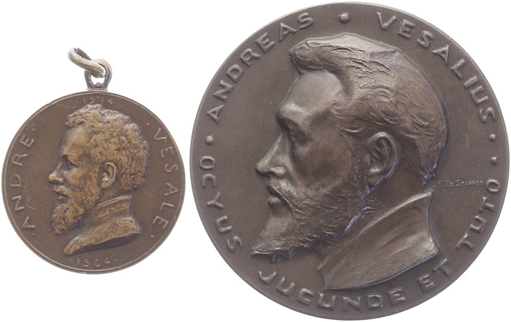 Lot (2) 1904 Bruxelles. Congrès Internat. des Physiologistes aux institut Solvay. Borstbeeld Andresas Vesalius naar links. / Tekst achter boom. Æ 50. Brettauer 2464. Ch. van der Stappen. Prachtig. Toegevoegd: draagpenninkje 1914 Féderation Medicale Belge Æ 30.