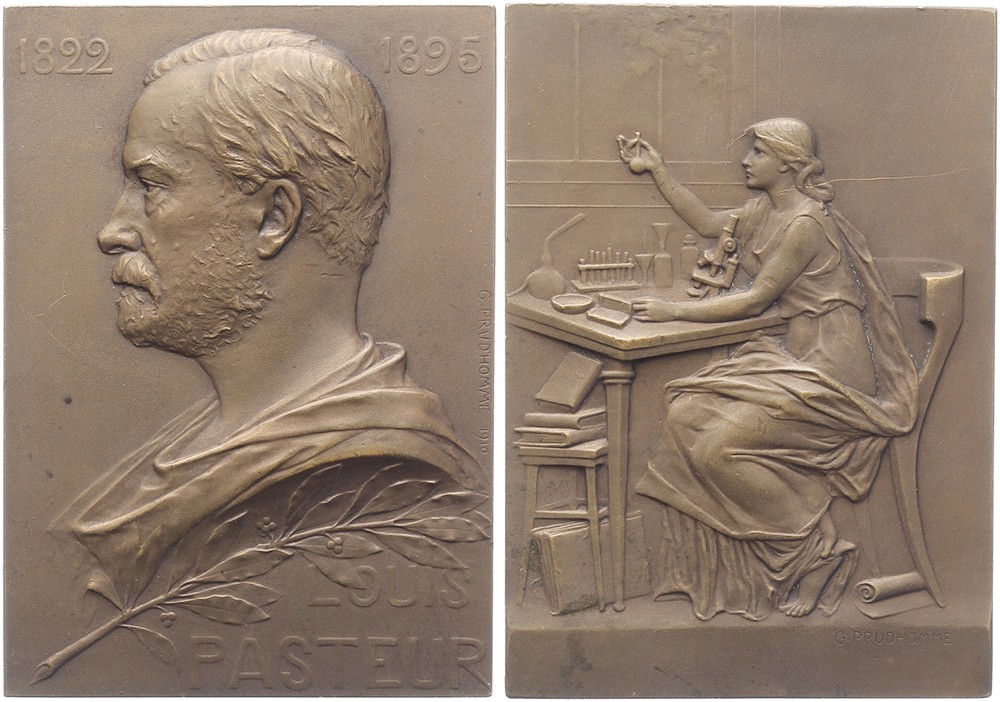 1910 à Louis Pasteur, 1822-1895. Borstbeeld Pasteur naar links. / Vrouw zit aan tafel met microscoop. Æ 73 x 51,8. G. Prud’homme. Prachtig.