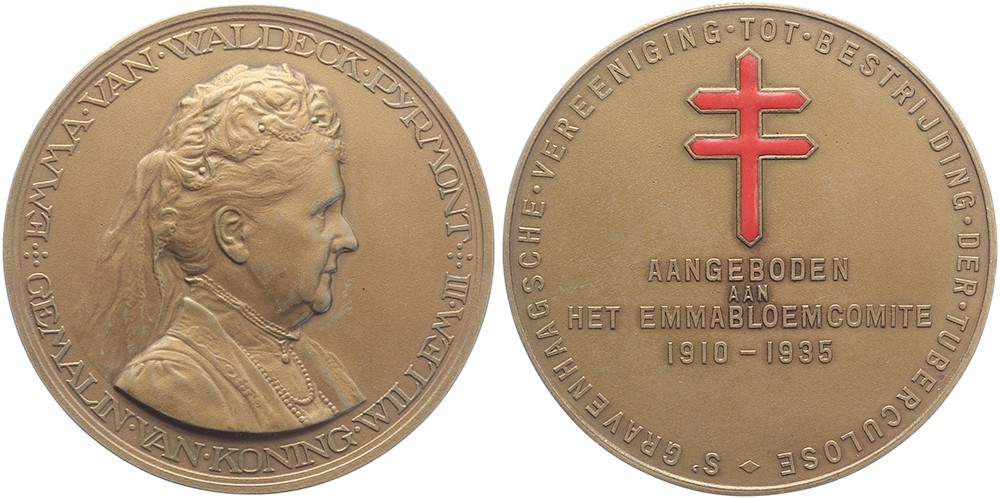 1935 Den Haag, 25e Emmabloem-collecte. Borstbeeld koningin-moeder Emma naar rechts. / Rood geëmailleerd TBC-kruis boven vierregelig opschrift. Æ 60. KB V-899. J.J. van Goor. Prachtig.