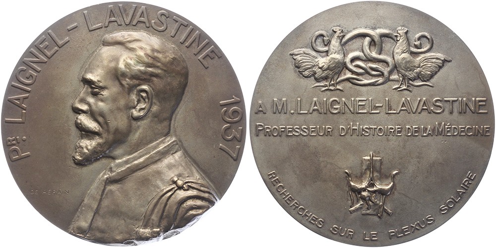 1937 à M. Laignel-Lavastine, prof. d’histoire de la médecine. Borstbeeld naar links. / Tekst tussen twee hanen, twee slangen en gestileerde plexus solaris. Æ 80. Freeman 287. F. de Hérain. Zeer fraai.