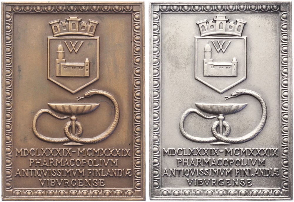 Lot (2) 1939 Pharmacopolivm Antiqvissimvm Finlandia Vibvrgense. Wapen van Vyborg boven apothekersembleem. / Zestienregelig opschrift met namen en data. Æ + AR [114,83 gr.] 70,5 x 51. Prachtig. N.B. Ex veiling 30 Laurens Schulman, november 2004, kavel 2193