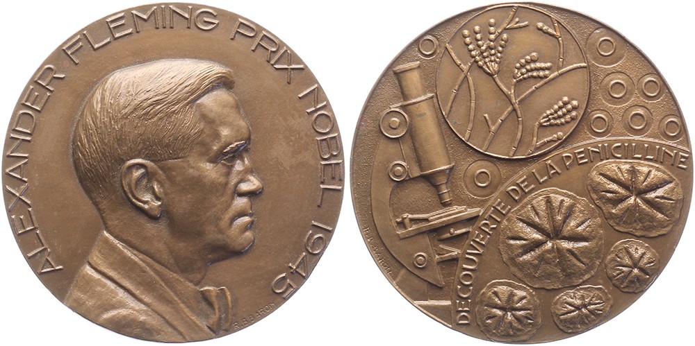 1945 Alexander Fleming, Prix Nobel. Borstbeeld Fleming naar rechts. / Microscoop, schimmelkweken etc., DECOUVERTE DE LA PENICILLINE. Æ 68,5. R.B. Baron. Prachtig.