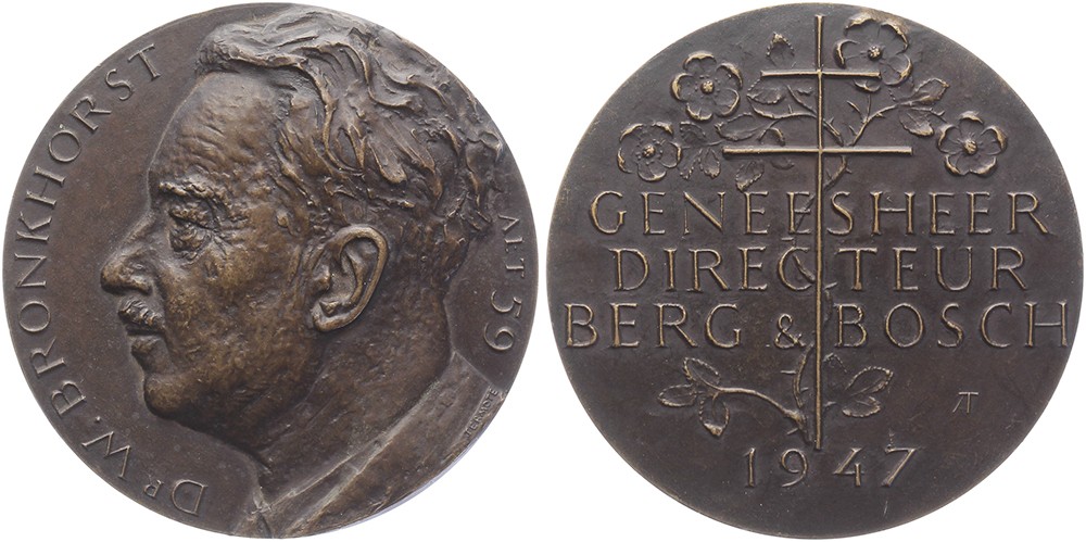 1947 Bilthoven. Dr. W. Bronkhorst, geneesheer-directeur Berg & Bosch. Hoofd Bronkhorst naar links. / Vierregelig opschrift met TBC-kruis. Æ 70. KB V-1702; Hofstee 50. Albert Termote. Prachtig.