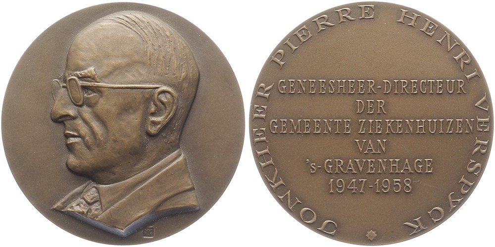 1958 Den Haag. Jhr. Pierre Henri Verspyck, geneesheer-directeur gemeente ziekenhuizen. Portret Verspyck naar links. / Tekst. Æ 60. KB V-2392. G.W.J. Rueb. Prachtig / FDC.