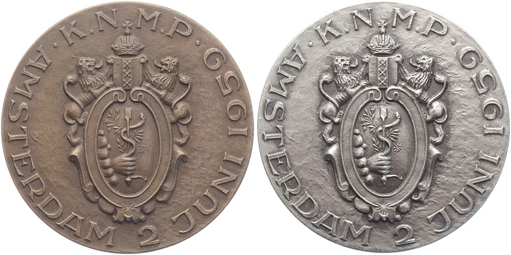 Lot (2) 1959 Koninklijke Nederlandse Mij. ter bevordering der pharmacie. Wapenschild Amsterdams Collegium Medicum. / Jaartal 1958 in dubbel omschrift. Æ + AR [52,21 gr.] 50,4. KB V-2465. (J.Ph. van Zegveld). Prachtig.