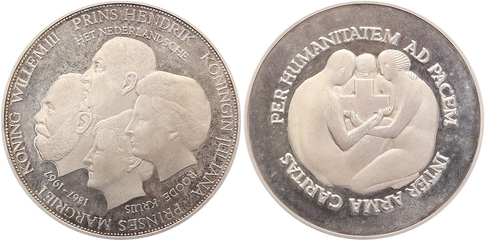1967 Eeuwfeest Nederlandse Rode Kruis. Hoofden prins Hendrik, koning Willem III, koningin Juliana en prinses Margriet naar links. / Drie zittende naakte figuren. AR 50 [49,51 gr.]. KB VI-3343. Joop Hekman. Vrijwel FDC.
