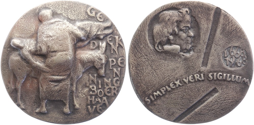 1968 Gedenkpenning H. Boerhaave. Scène v.d. ‘Barmhartige Samaritaan’. / Hoofd Boerhaave in medaillon, jaartallen 1668-1968, SIMPLEX VERI SIGILLUM AR gegoten 76-76,5 [175,72 gr.]. Hofstee 14, Beeldenaar 2002, pag. 21, nr. 53. (Eric Claus). Niet vaak voorkomend. Prachtig.