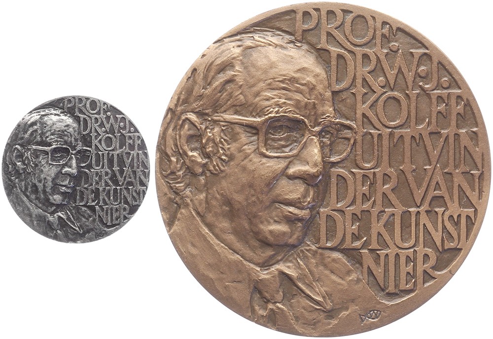 Lot (2) 1977 Nierstichting tien jaar. Portret Dr. W.J. Kolff naar rechts. / Zittende Kolff met kunstnier uit 1943. AR 22,5 + Æ 50. KB VII-4127. Willem Vis. Prachtig.