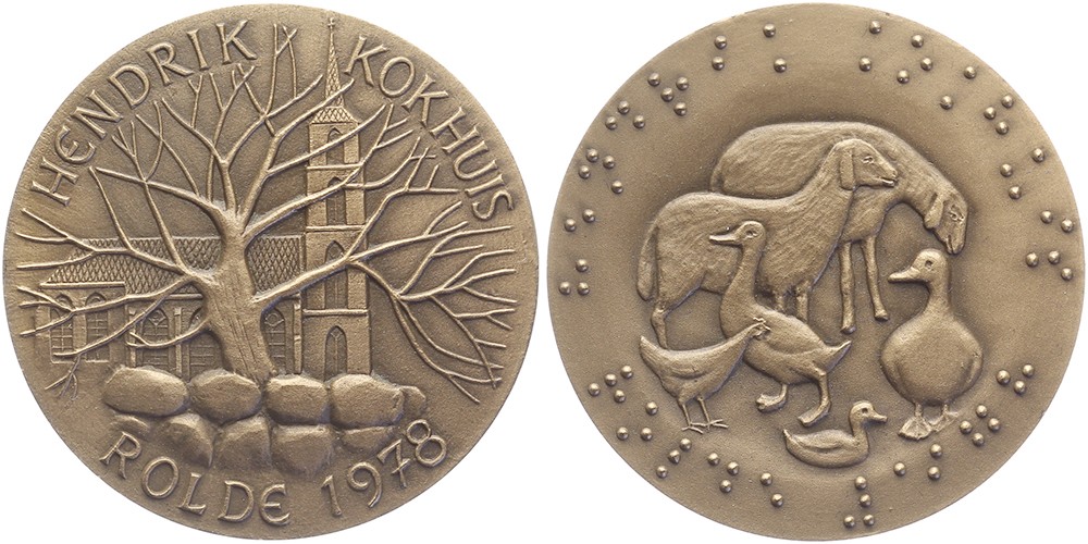 1978 Rolde. Hendrik Kokhuis. Dorpsgezicht in de winter. / Ganzen, schapen, haan en eend omgeven door braille. Æ 50. KB VII-4147. (Henk van Bommel). Prachtig.
