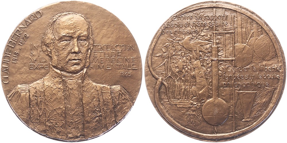 1978 Claude Bernhard 1813-1878. Borstbeeld bijna en face. / Vogel, kikker, konijn en laboratorium-glaswerk. Æ 70. M. Mocauot. Prachtig.